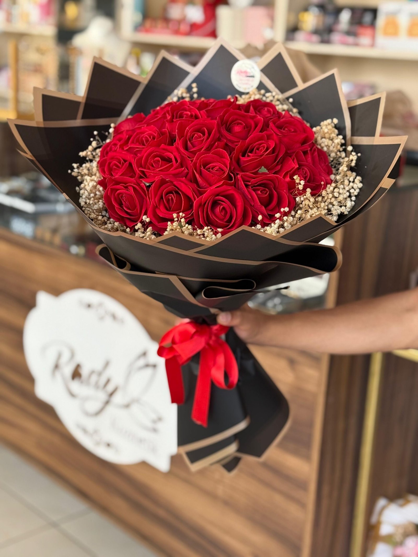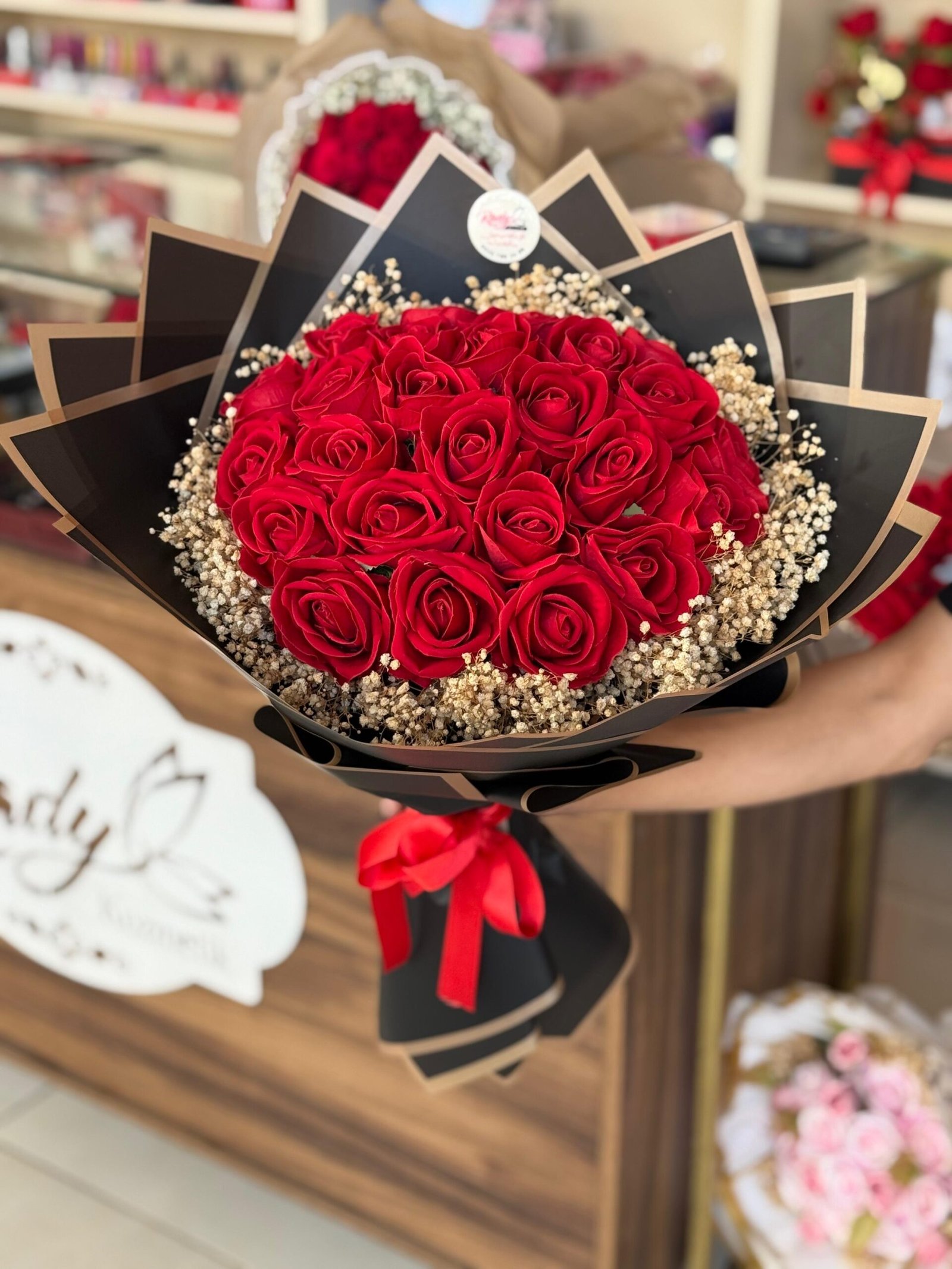 بوكيه ورد صناعي 27 وردة مع تغليف اسود وذهبي
