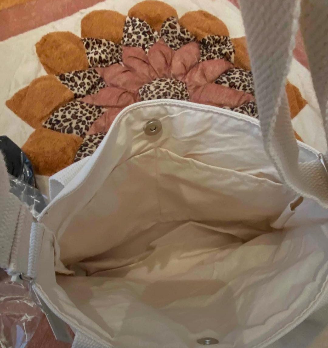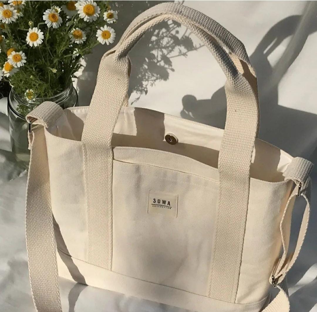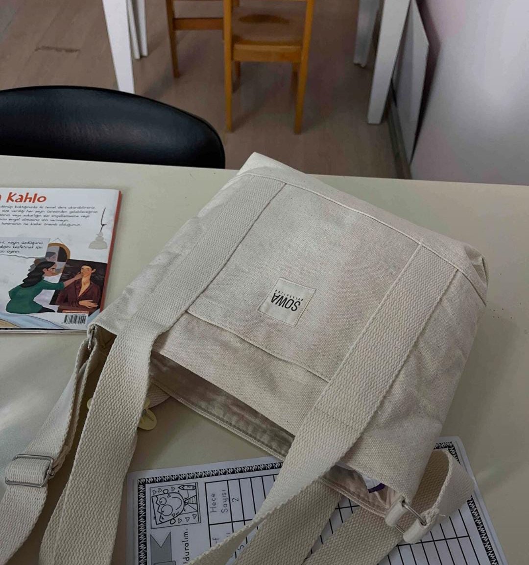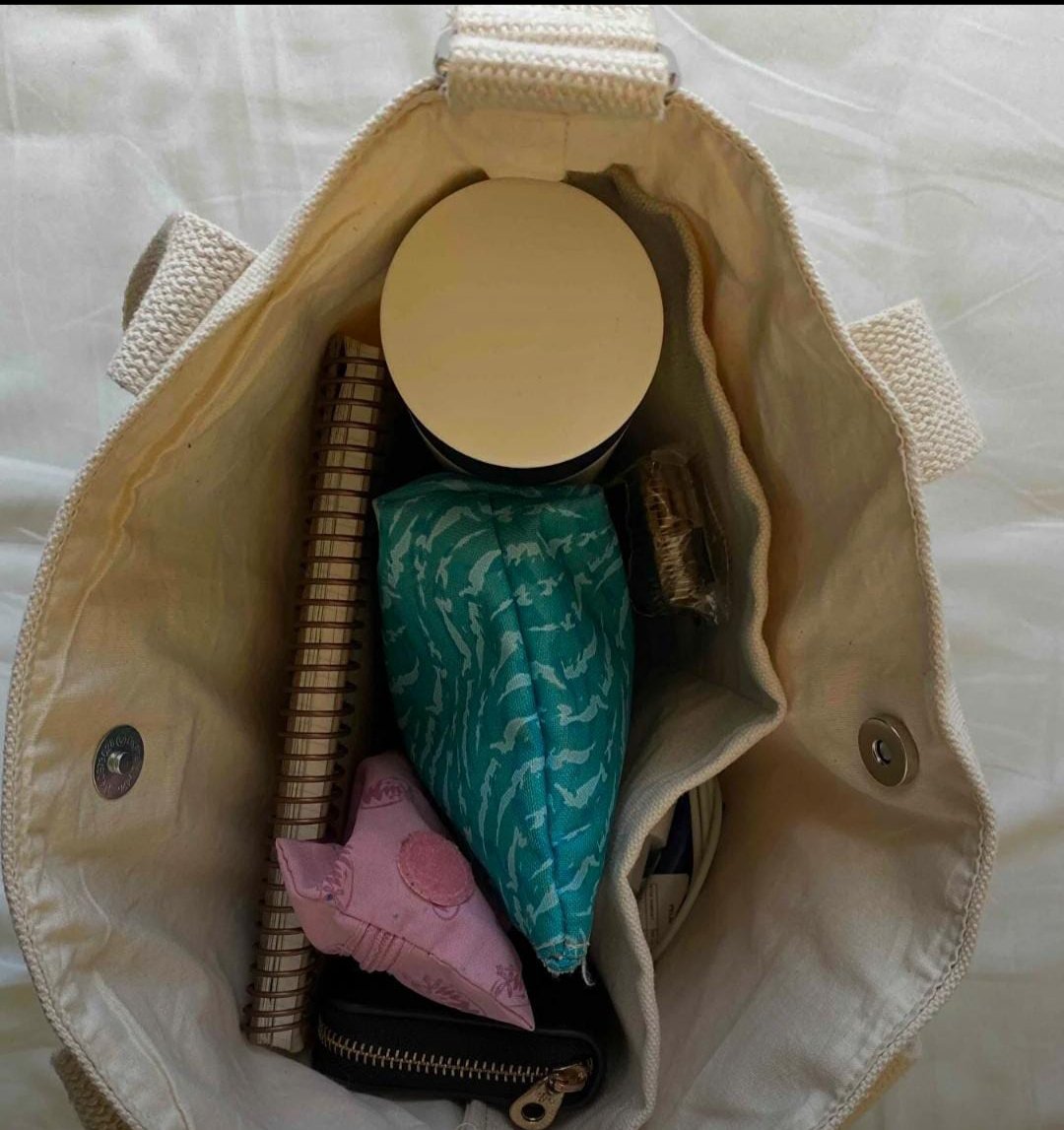 حقيبة قماشية بلون بيج هادئ تجمع بين البساطة والفخامة، مصنوعة من قماش متين بجودة عالية، مع مساحة واسعة لتحتفظي بكل ما تحتاجينه خلال يومك.