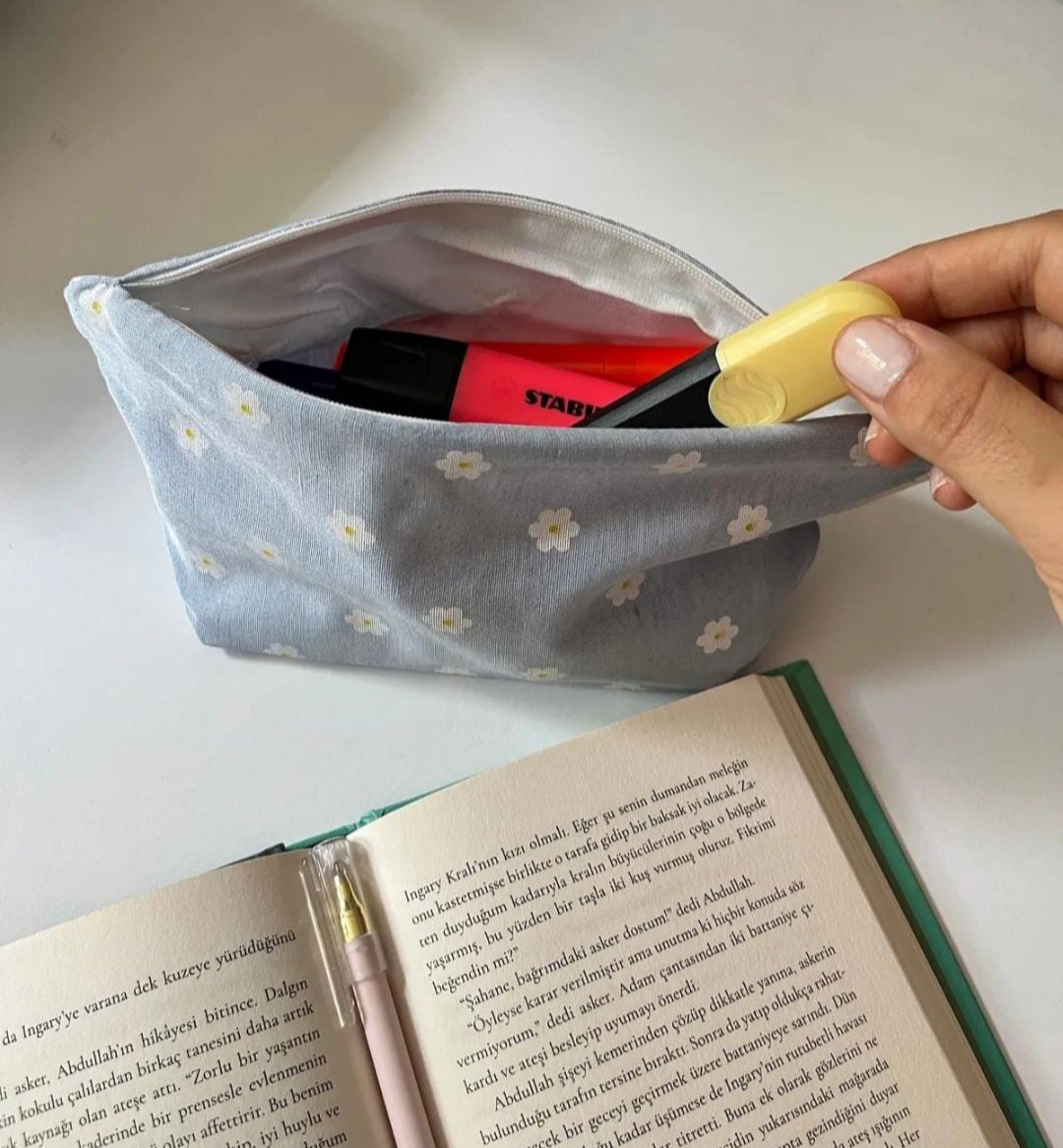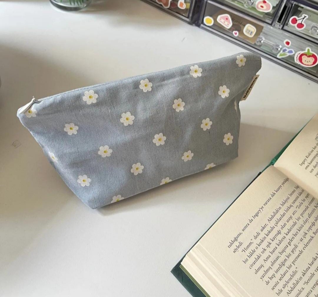 ممتاز 👌✨ هاي الصورة بتفرجينا مقلمة قماشية بسيطة وناعمة مع رسمة وردات صغيرة، شكلها مرتب وعملي كتير ✨🌸